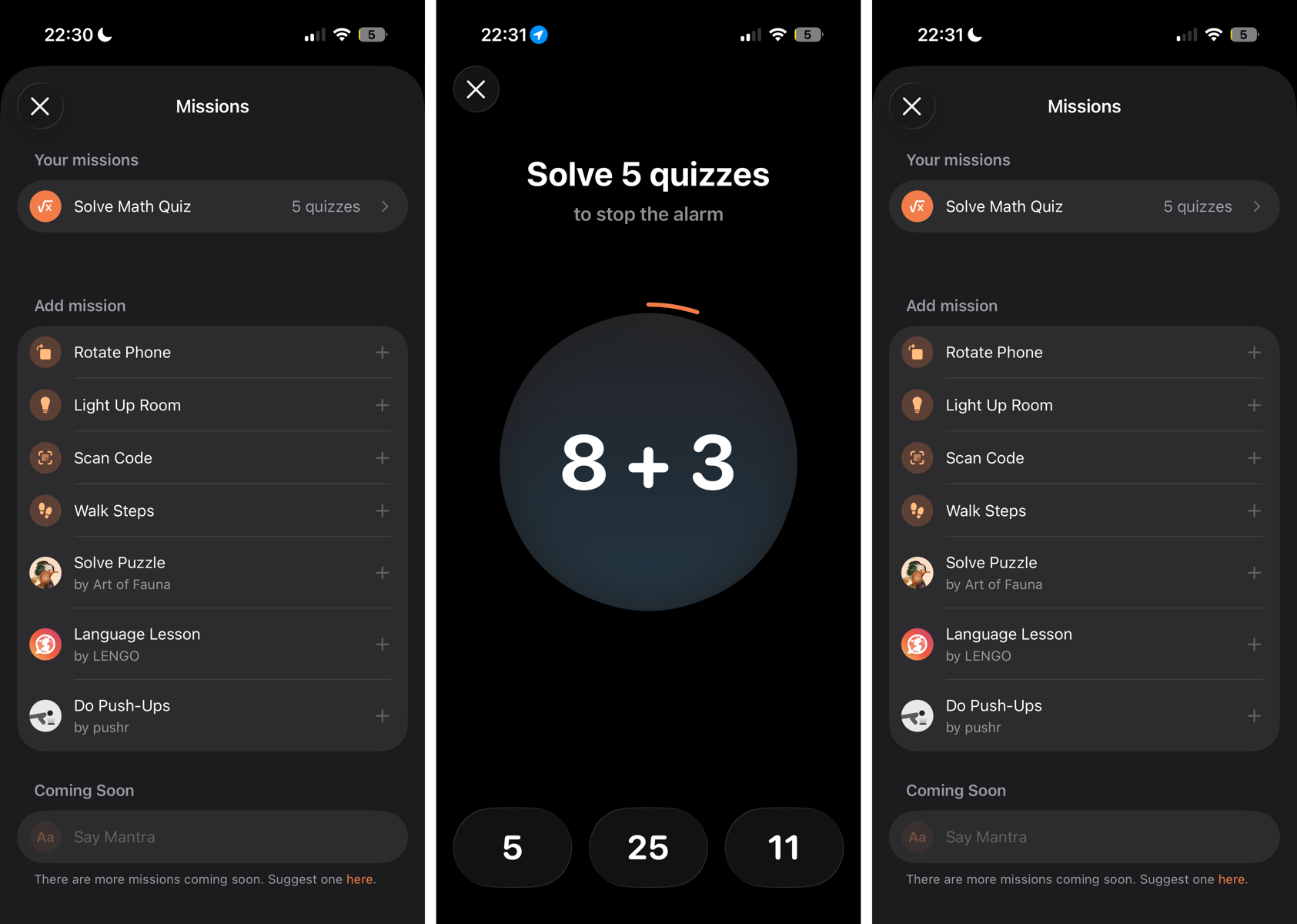Now for the core of the app, the missions. These are essentially actions that will happen automatically, or activities that you need to complete in order to turn your alarm off in the morning.